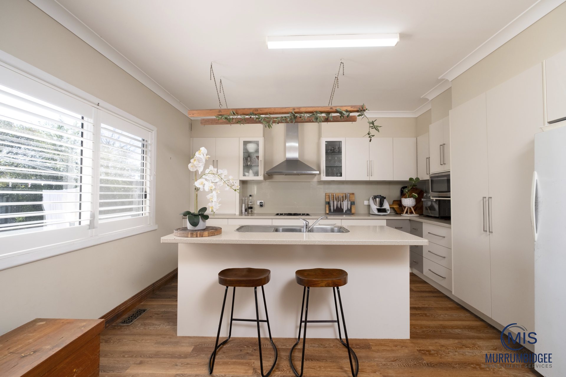 Well-established gardens surround a contemporary façade with a private front door entering from the front verandah. Stepping into the semi-open-plan living domain, a subtle palette is highlighted by natural light streaming through plantation shutters. An updated kitchen offers excellent cupboard space, island bench, gas cooking, and quality appliances with a large, adjacent dining area.